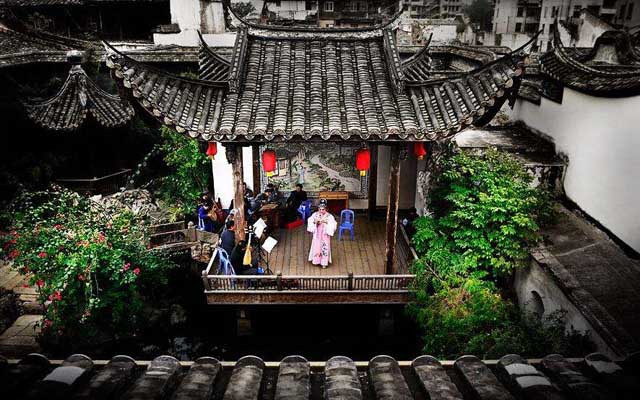 水榭戏台 水榭戏台位于福州市三坊七巷历史文化街区衣锦坊东口北侧,全国重点文物保护单位,面积2357平方米,穿斗式木构架,双坡顶。宅院创建于明万历间(1573-1620年),后经多次改建。清道光年间,布政使孙冀谋买下宅子,扩建成为三座相邻、全坊最大的宅院。第一座为主座大院,第二座为杂院,第三座为花厅园林,其中建在花厅的水榭戏台是整座建筑最精华所在,也是福州市现存唯一的水上戏台,故“水榭戏台”成为整座宅子的代名词。
